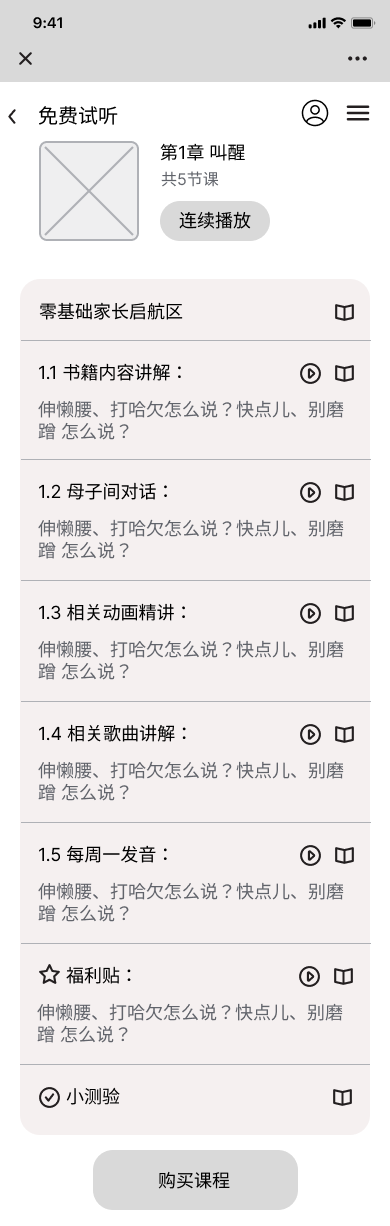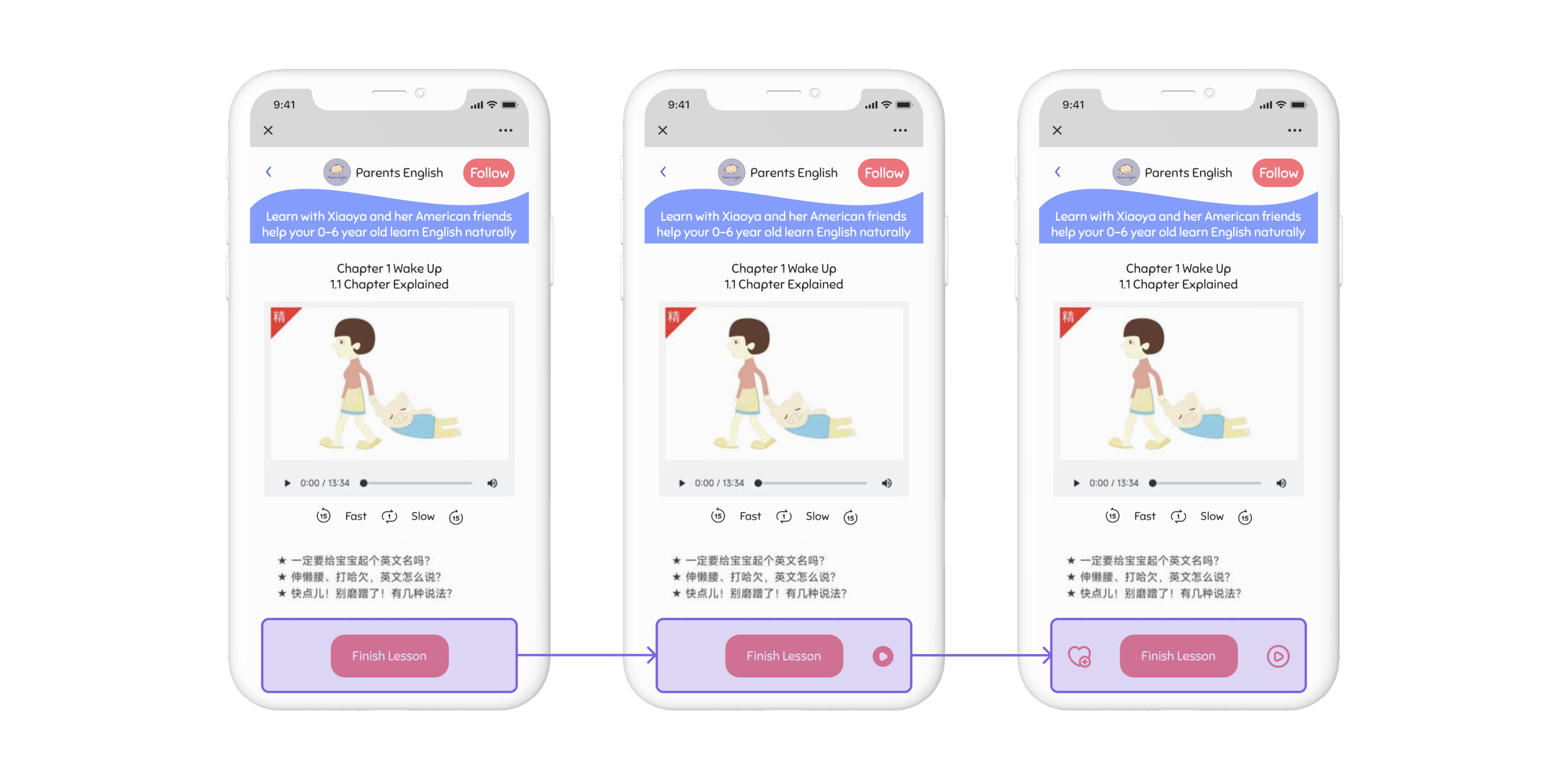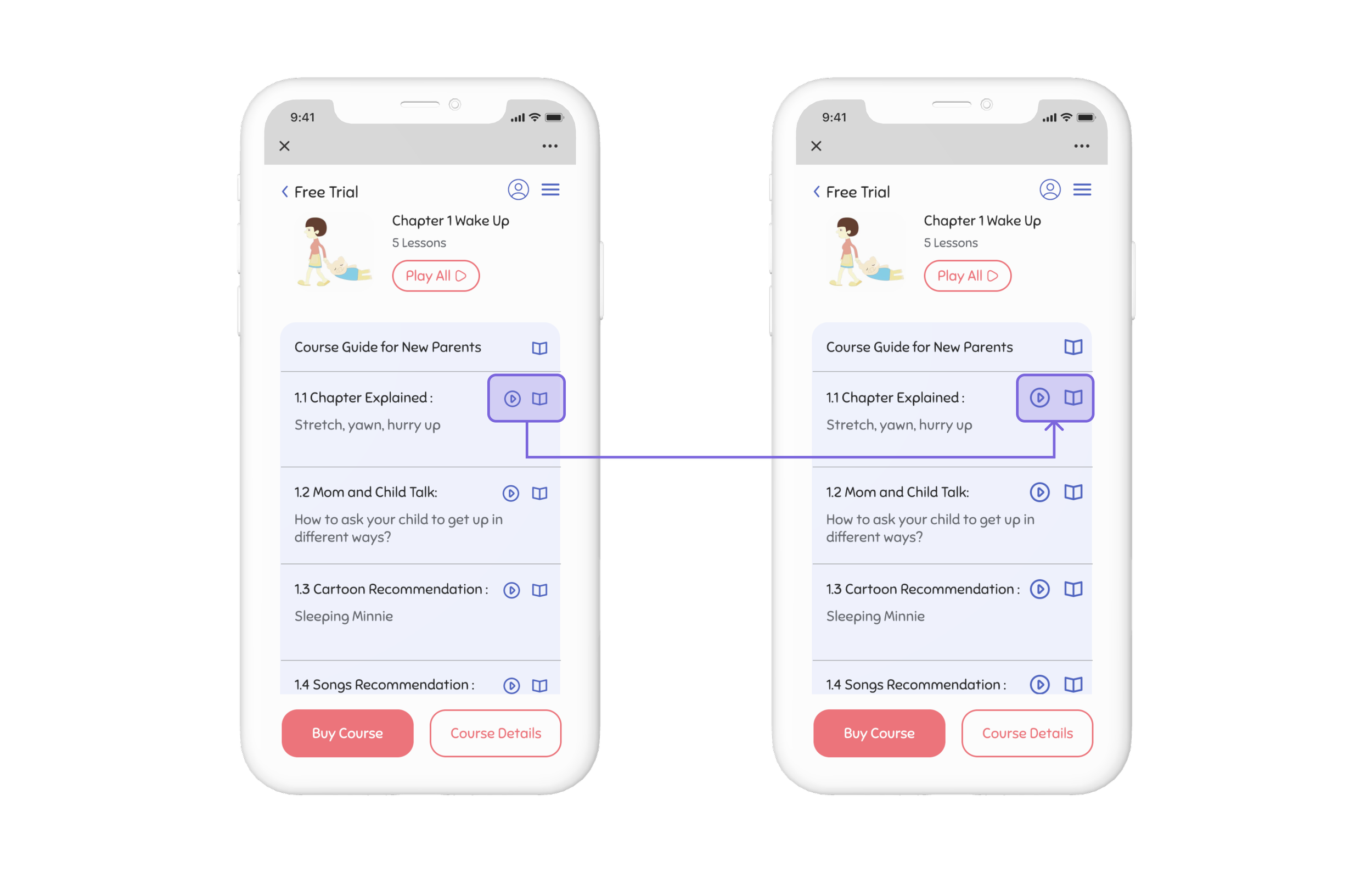 According to feedback from the usability test, the size of the touch point could possibly lead to mis-click which might be the reason of the low success rate of task 5. Therefore, I made an iteration to increase the size of the “Play Audio” and “Go to Lesson” icon to make the touch target more clickable.