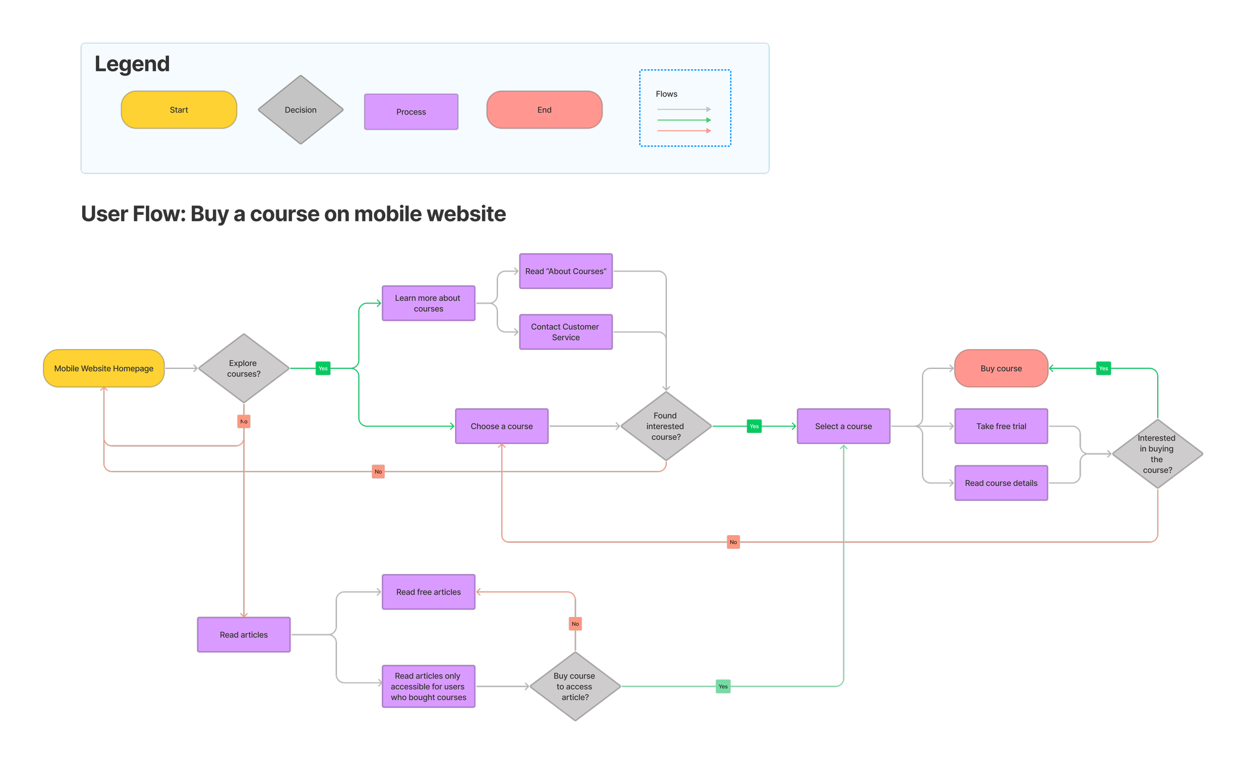 After discussing with my client, we decided to focus on optimizing the process of taking courses on mobile website. To find all the paths users can take to buy and learn a course and all the screens needed to complete the task, I created a user flow for buying a course based on the mobile sitemap. In this user flow, users can access the courses through either the navigation of Learning Courses or Read Articles.