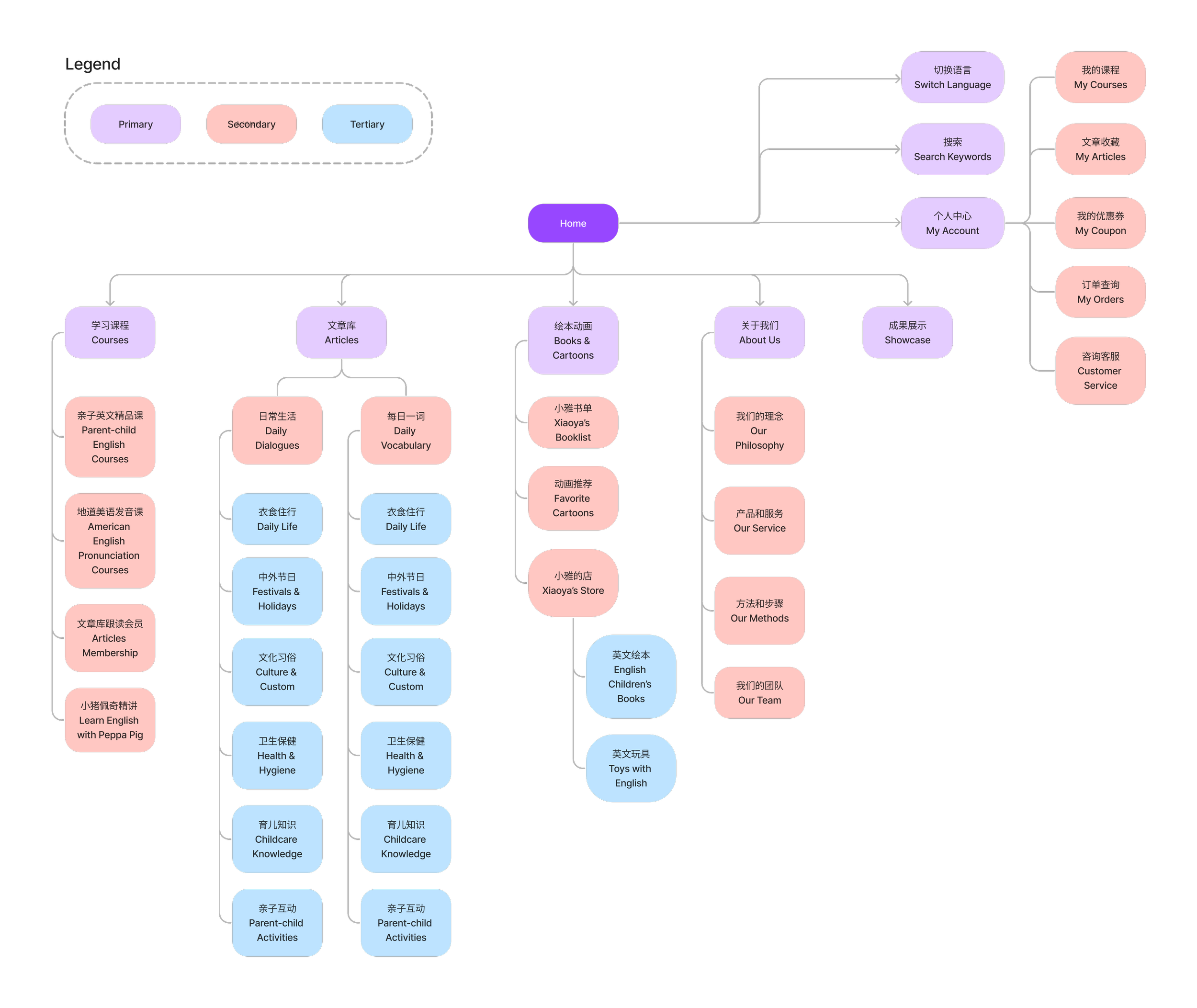 With the users and my client’s needs defined, I started the ideation process by designing the sitemap for the desktop and mobile website. There are some slight differences in the website structure for desktop and mobile because of the different purposes and functions of the two interfaces. The user research result shows that more than 97% of users view contents on their phone. Therefore, the mobile website design emphasizes on optimizing the learning experiences, including reading articles and taking courses. Whereas the desktop website emphasizes on marketing purposes, where About Us was included in the main navigation which demonstrated the philosophy and services of the company.