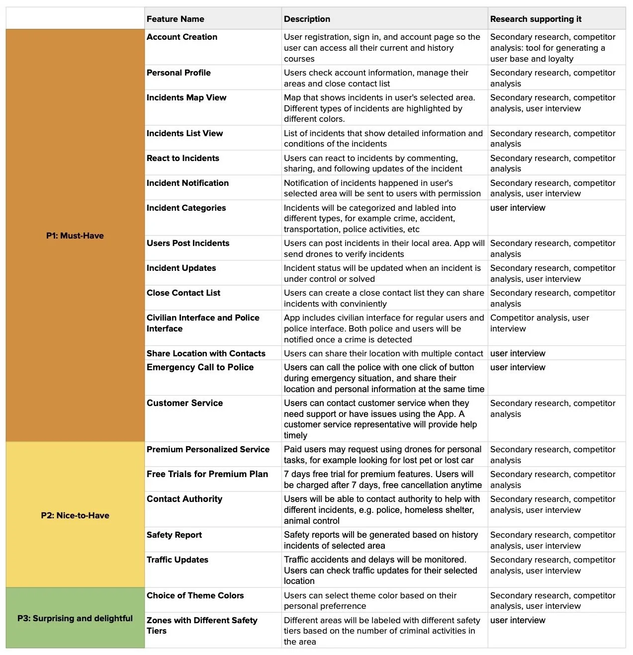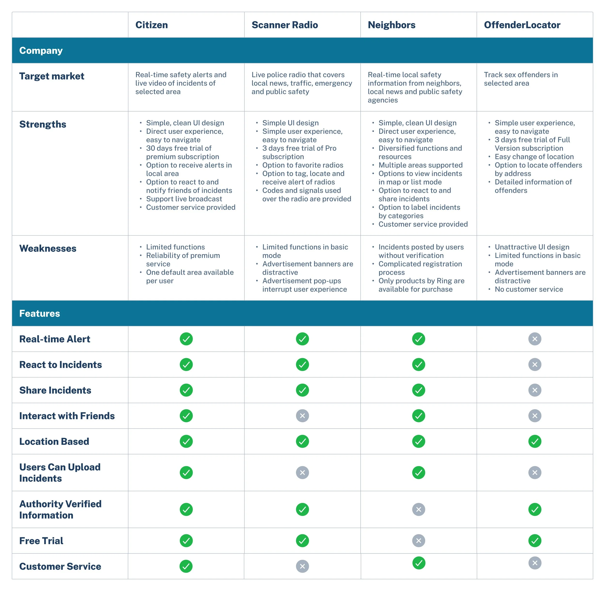In order to create an intuitive user experience, it is important to learn the competitor App features and the users’ needs. Learning about competitors will help me define the main functions that are standard for a safety utility App. Understanding the users helps me paint a clearer picture of what features are valuable for users in order to create a seamless experience.