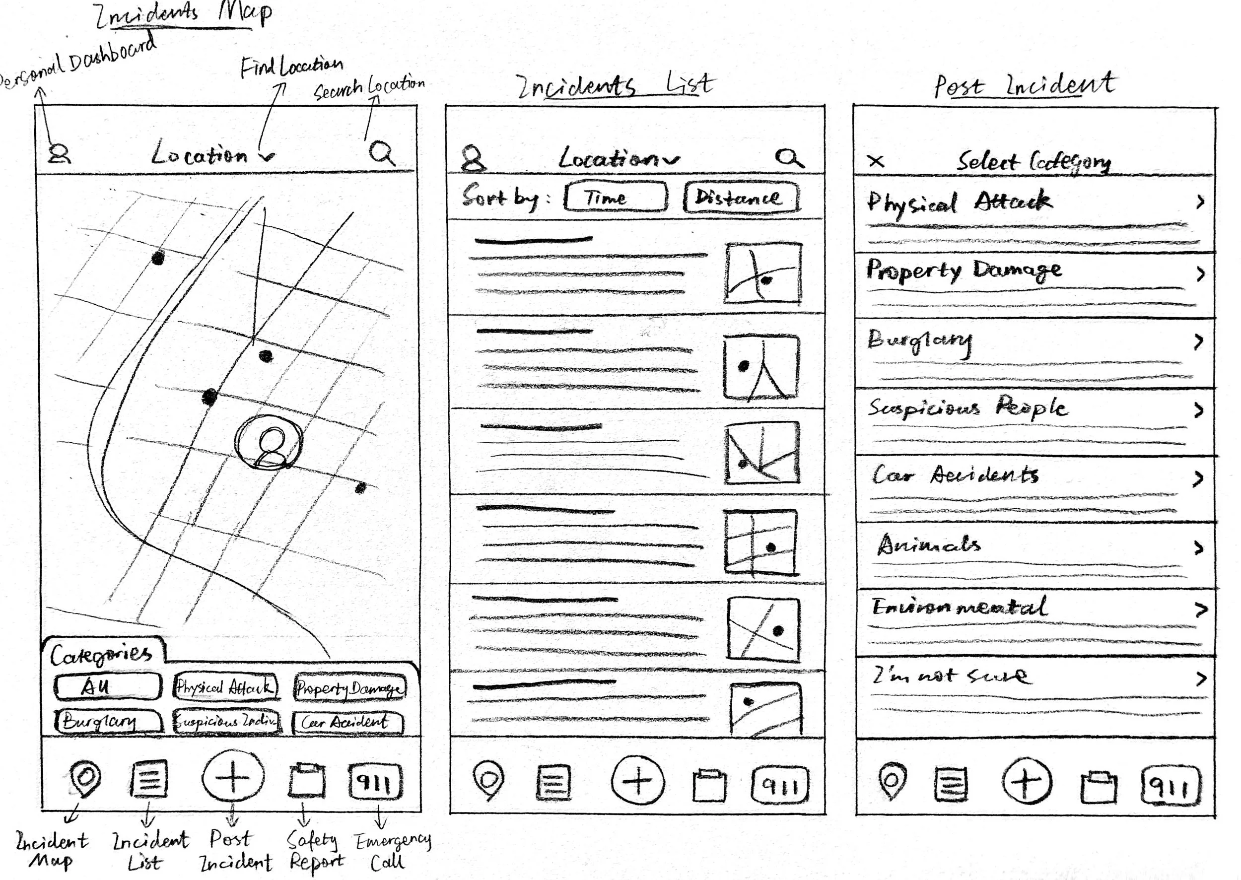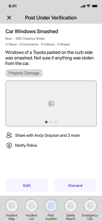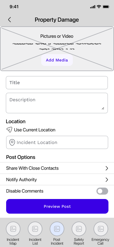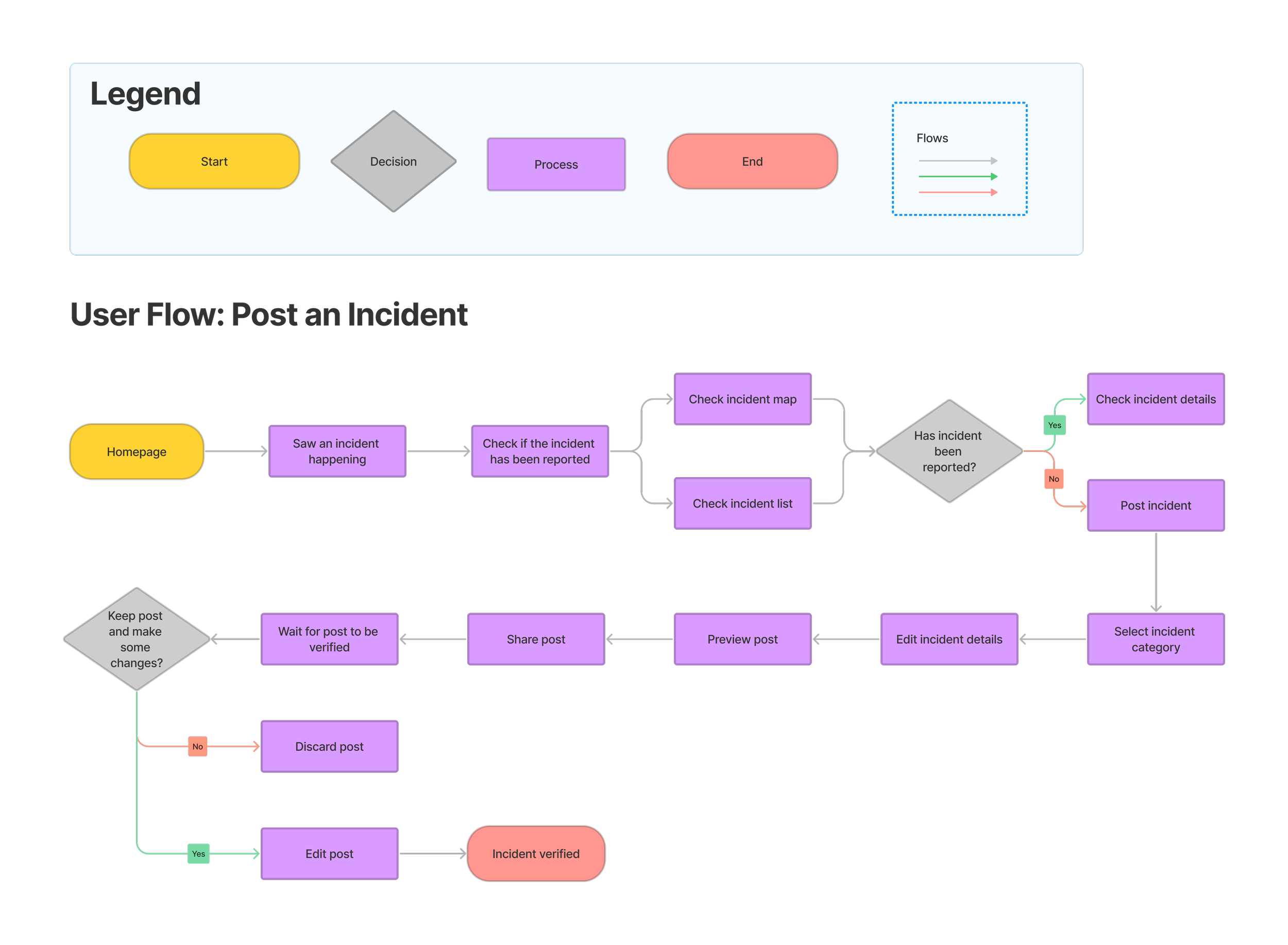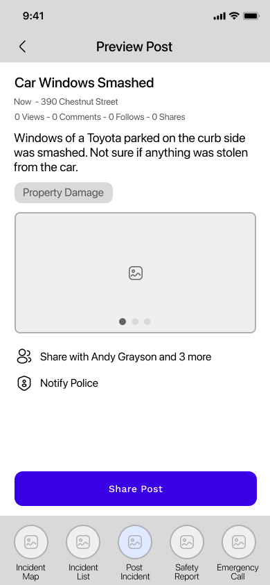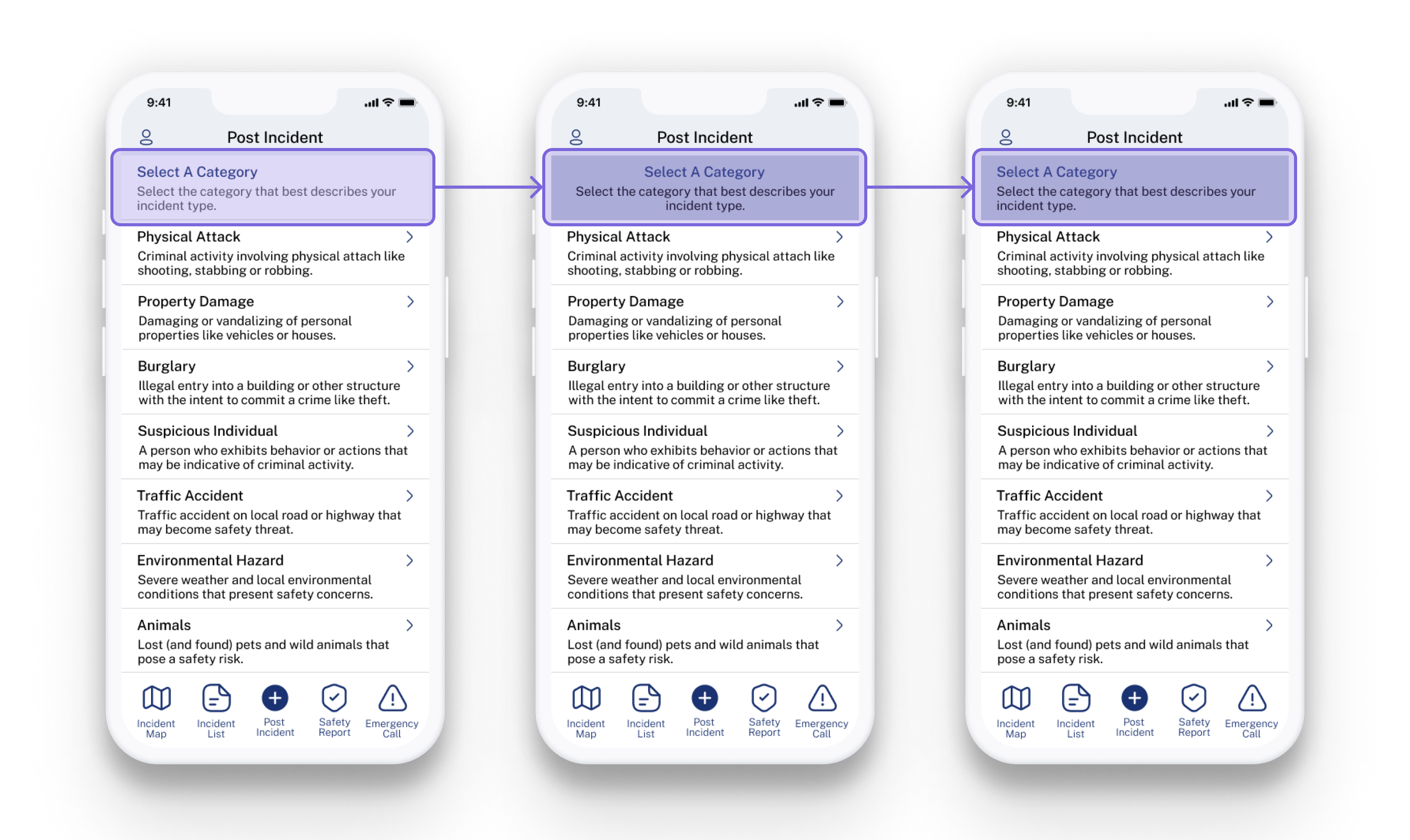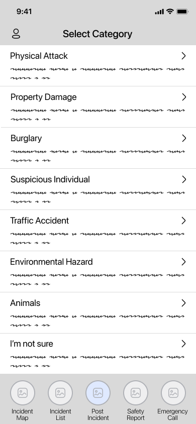 During my user interviews, most users expressed that they would like to have the option to post incidents they witnessed to notify others. Therefore, I created the user flow of posting an incident. I also positioned Post Incident in the center among all five navigations since it’s the feature that gives users the most control which encourages user interaction with the App.