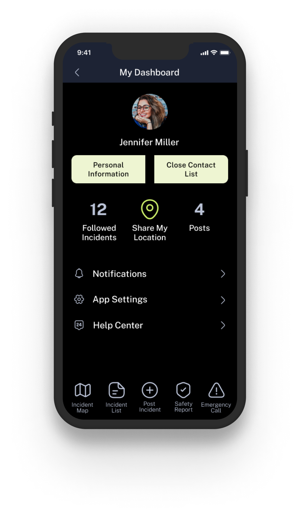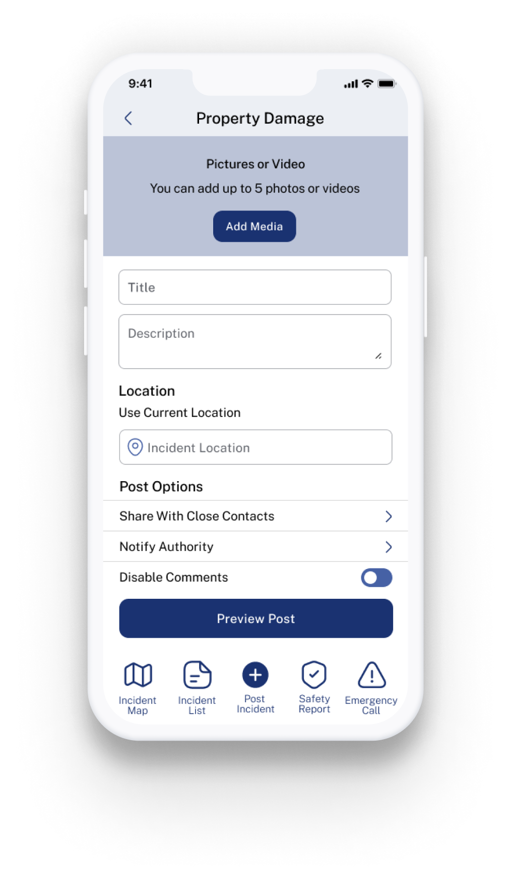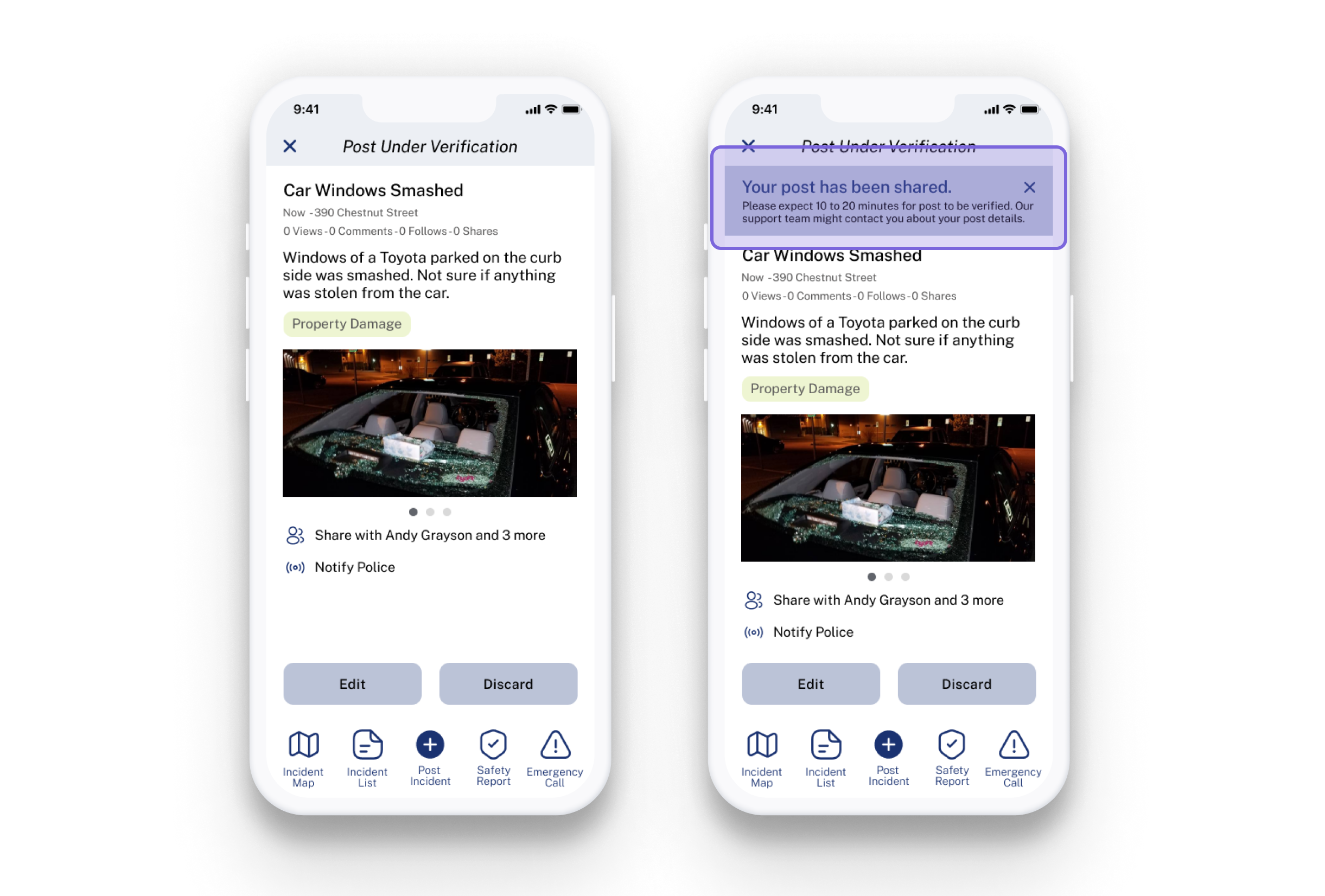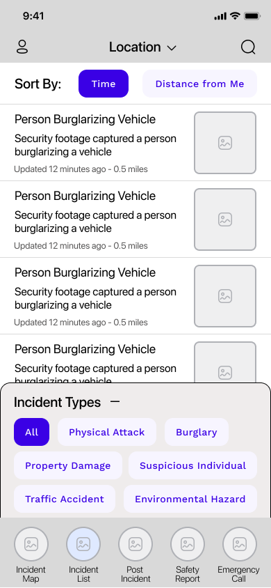 During my user interviews, most users expressed that they would like to have the option to post incidents they witnessed to notify others. Therefore, I created the user flow of posting an incident. I also positioned Post Incident in the center among all five navigations since it’s the feature that gives users the most control which encourages user interaction with the App.