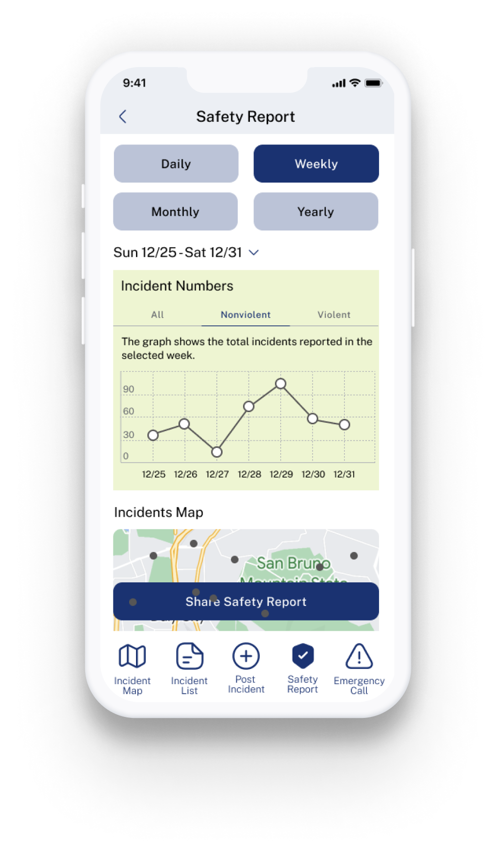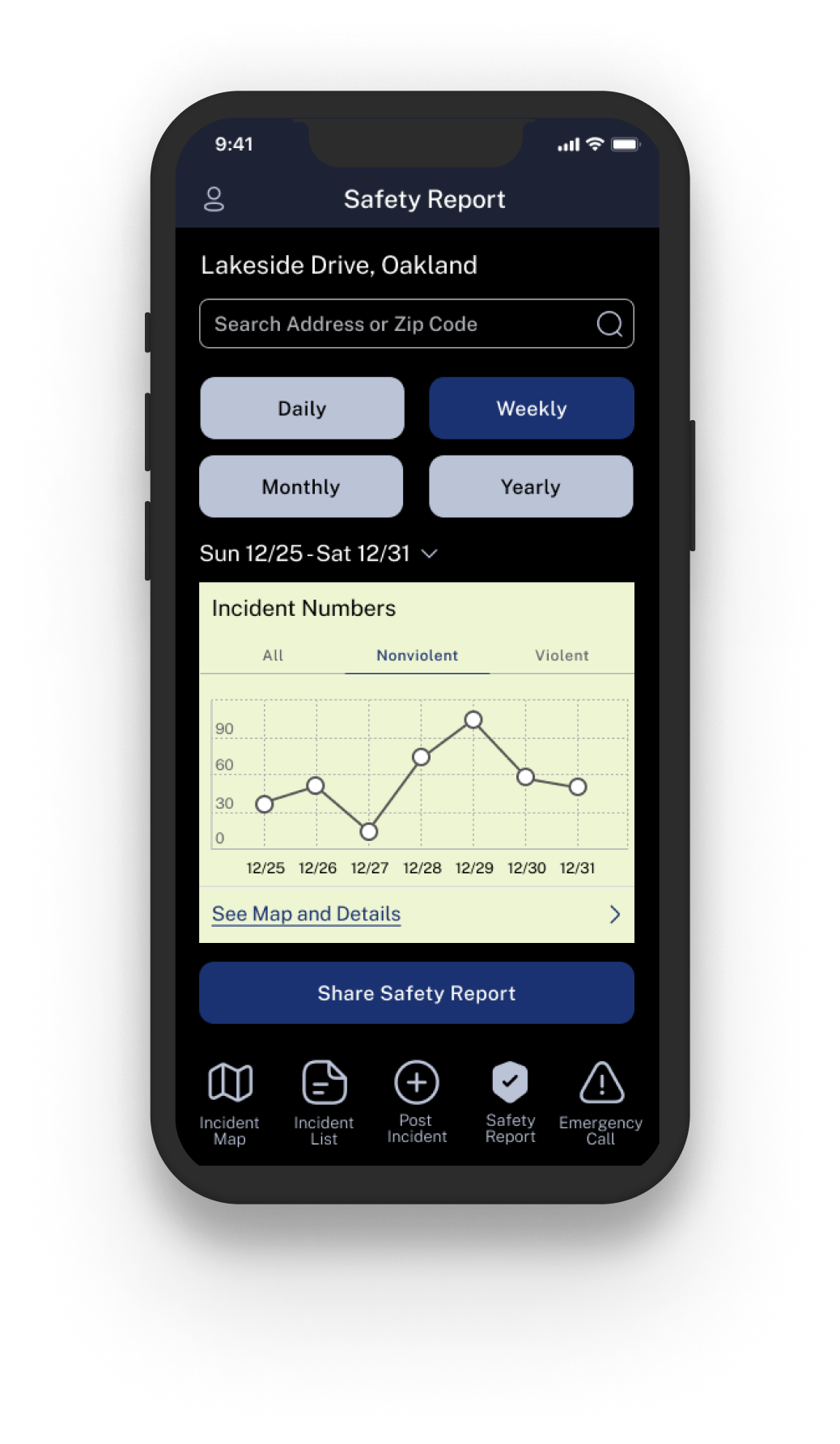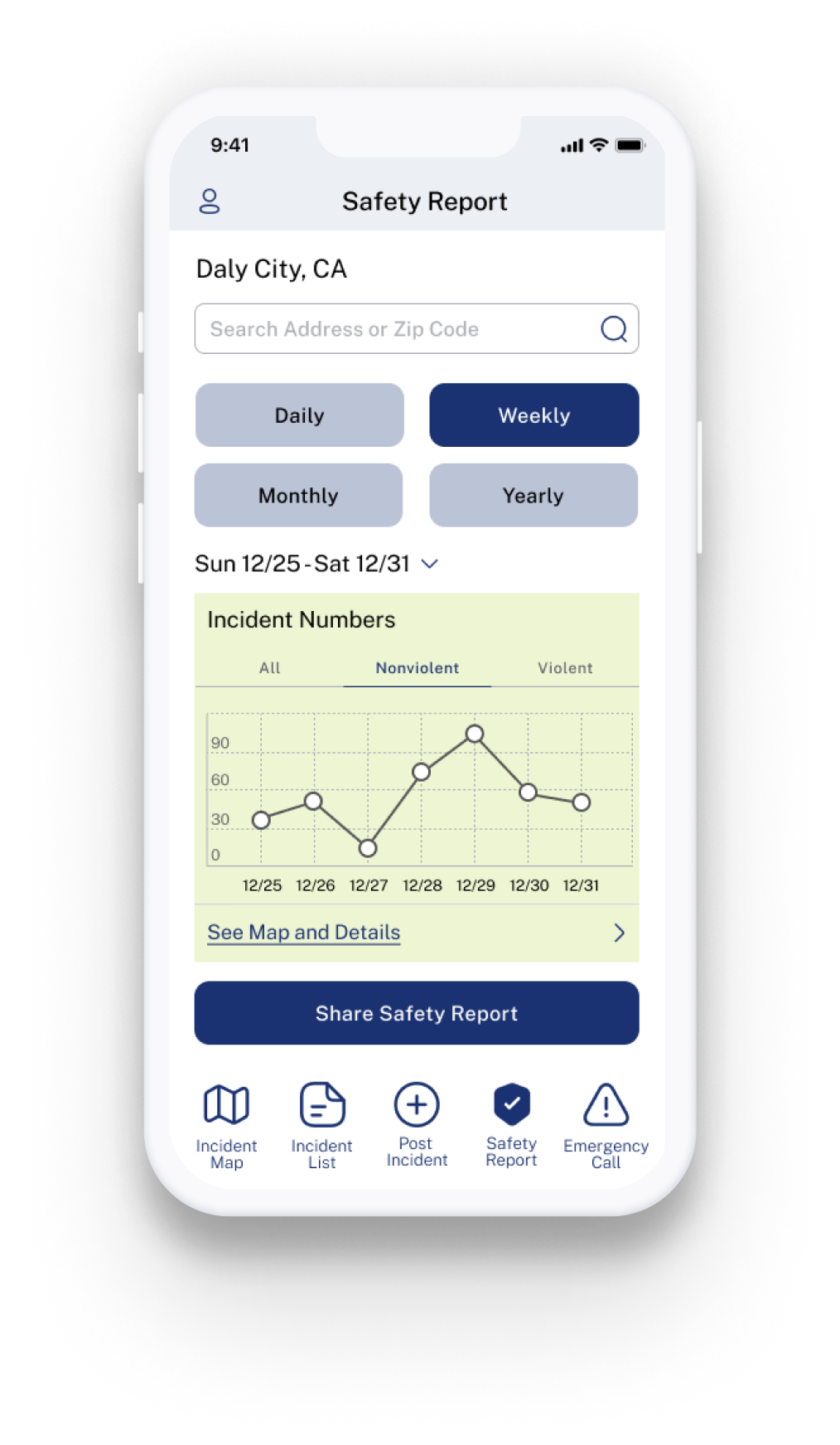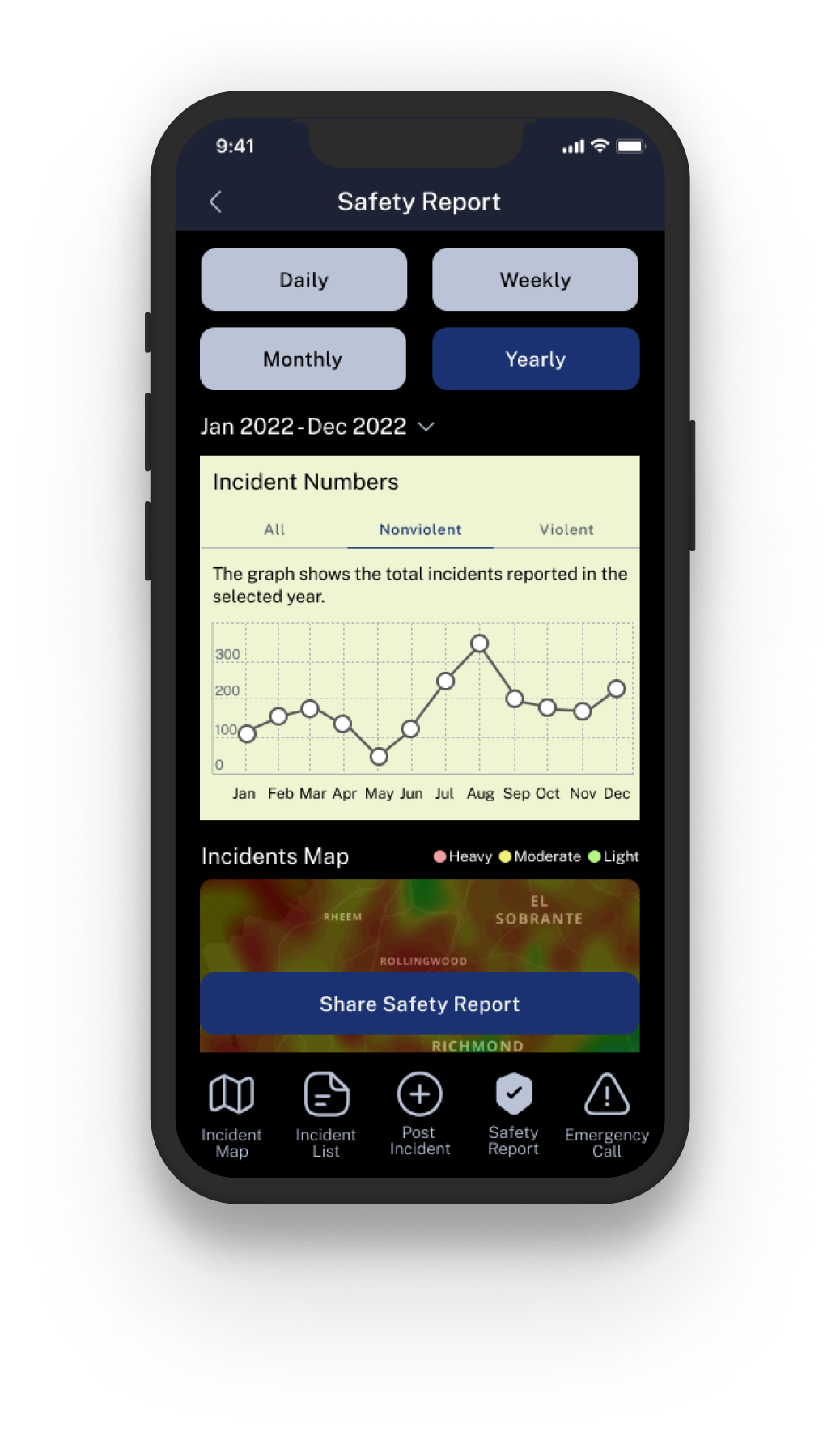 Check the safety report for your selected area by different time frames. Stay safe by identifying patterns of incidents.