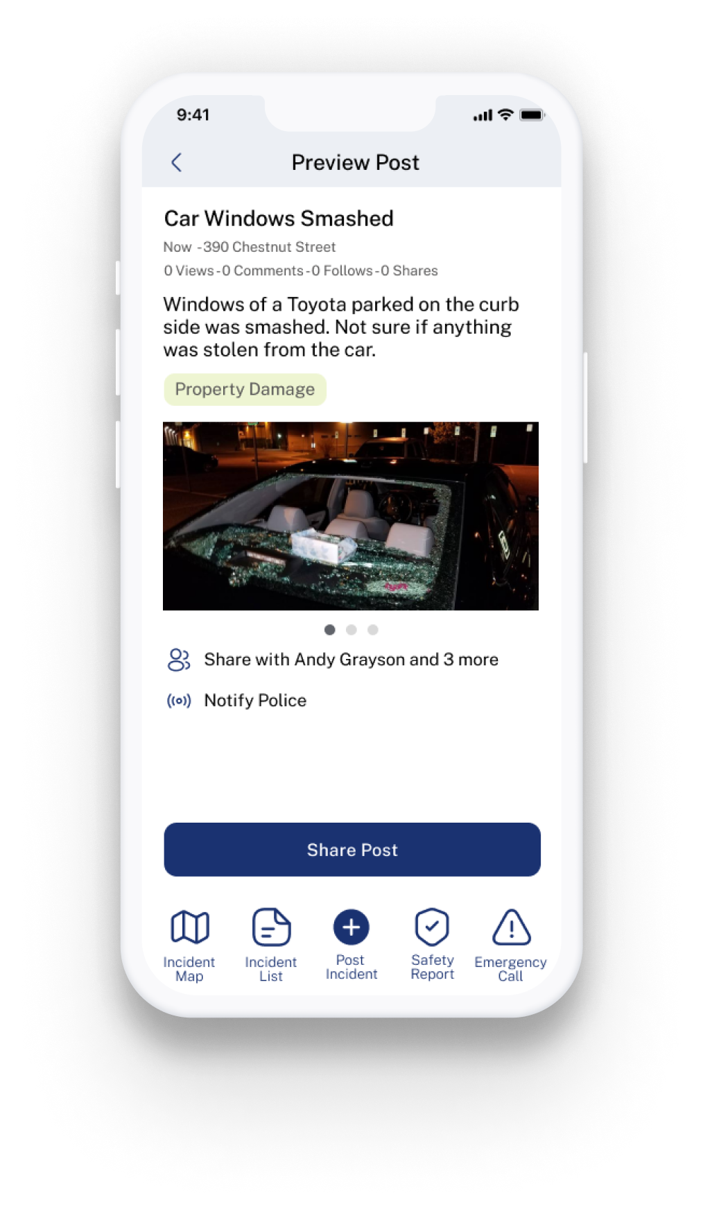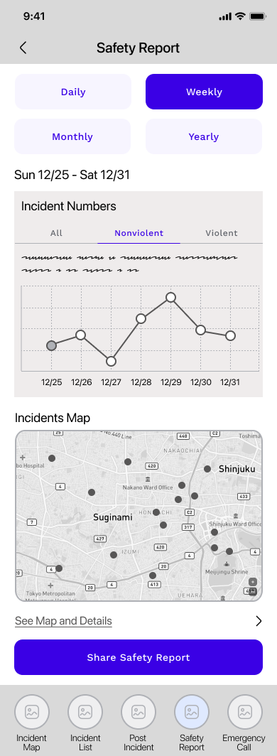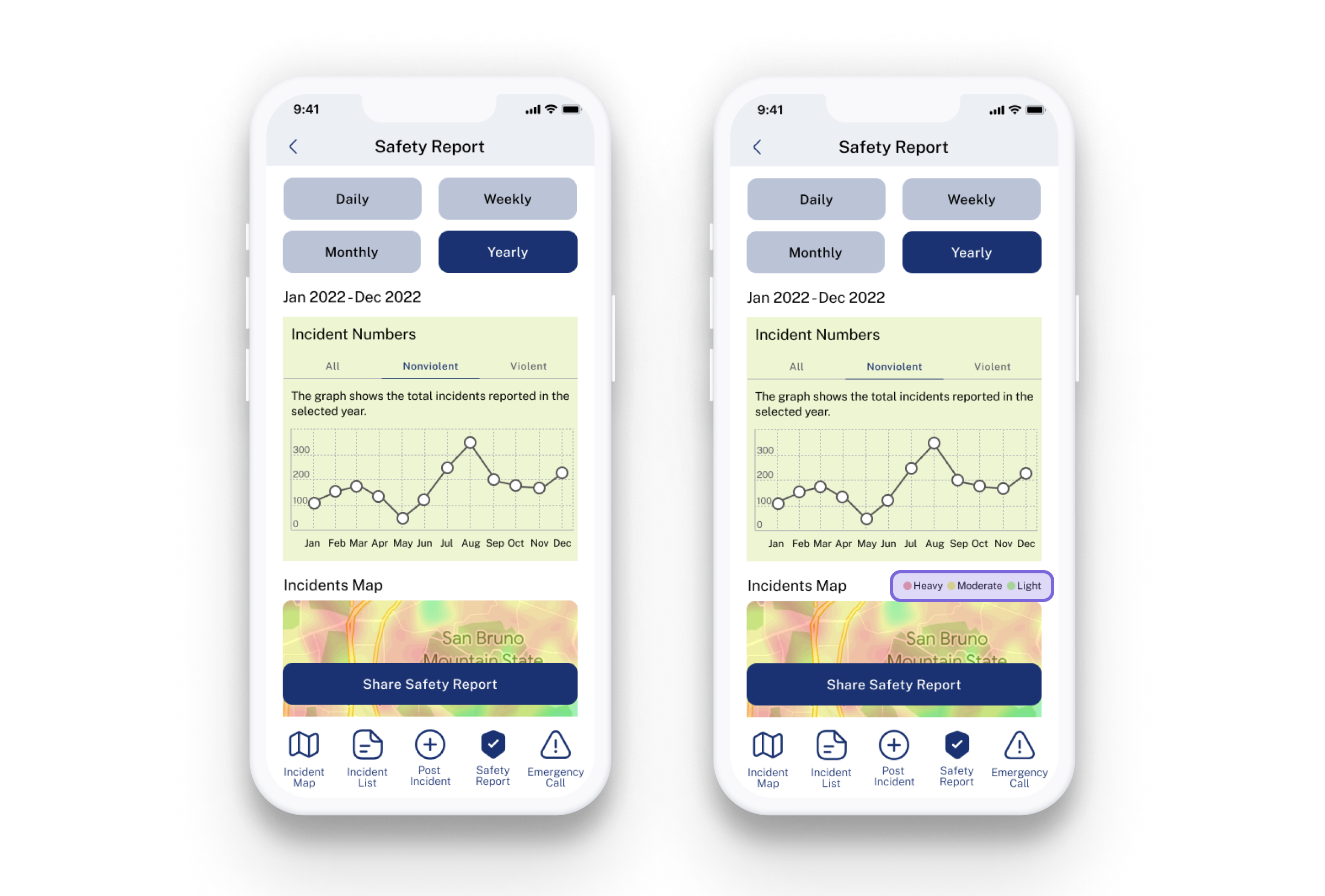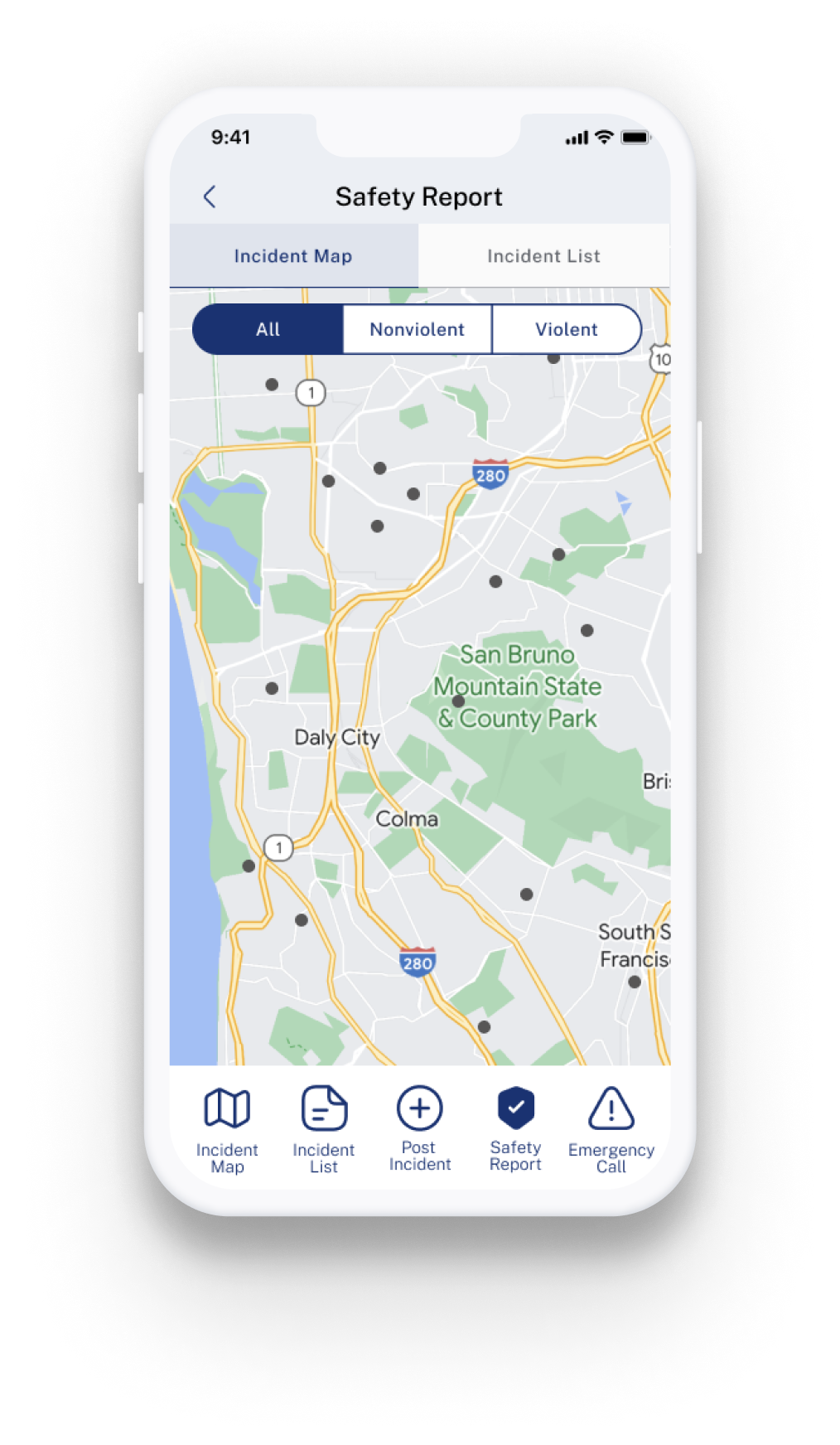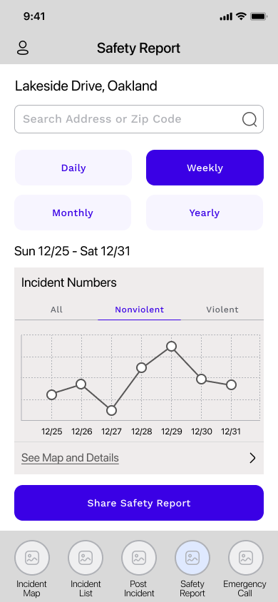 Check the safety report for your selected area by different time frames. Stay safe by identifying patterns of incidents.