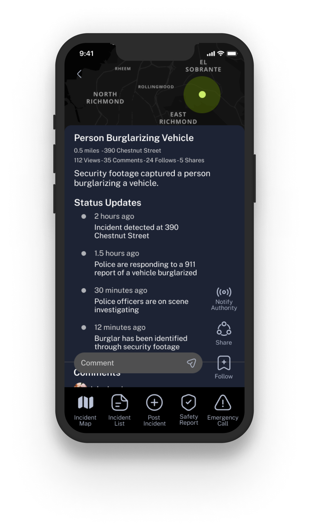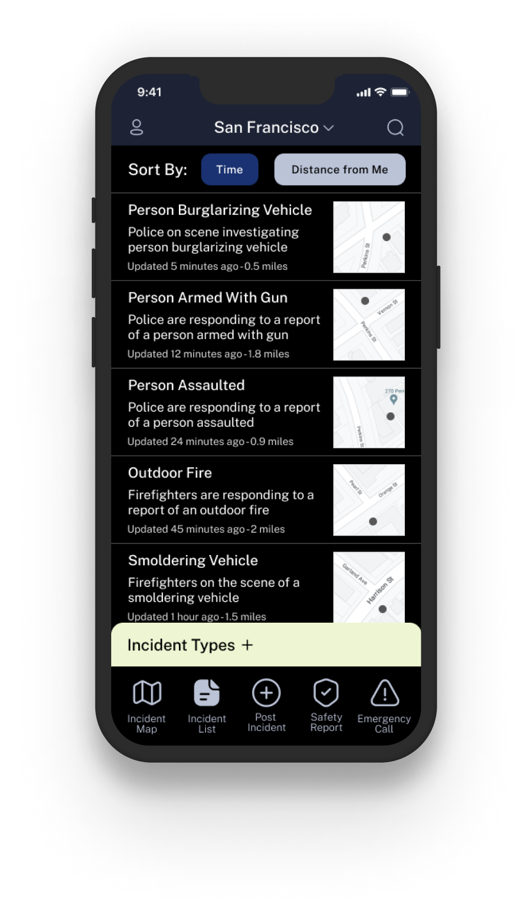 Check incidents in your area in map view or list view. Filter incidents by types, time or location. See detailed information of an incident and get real-time updates.