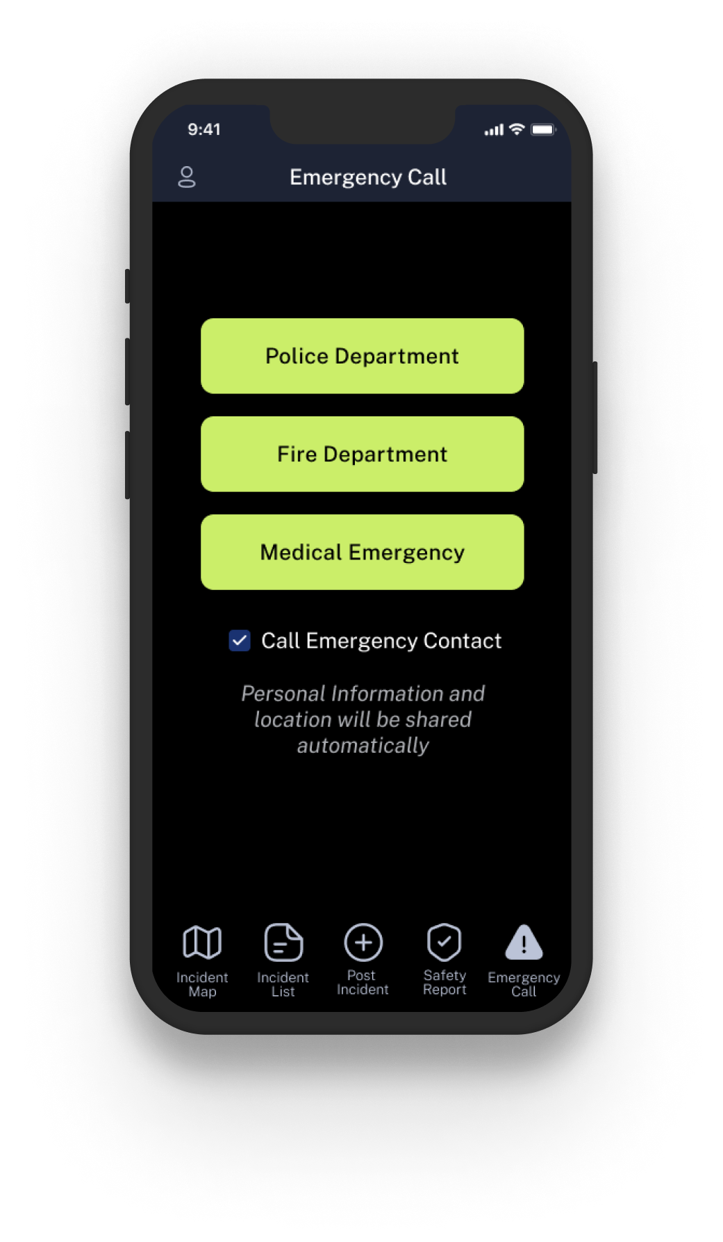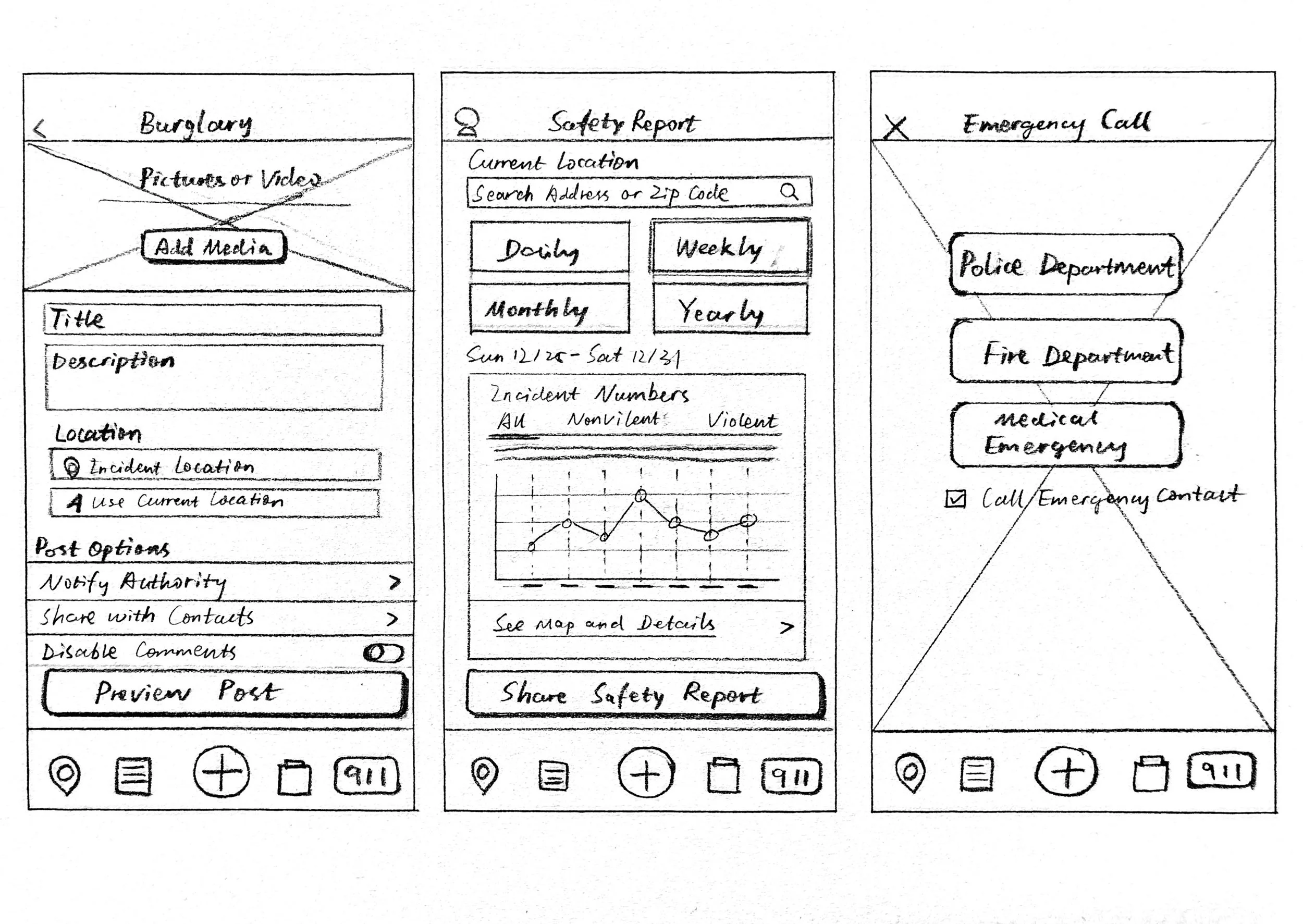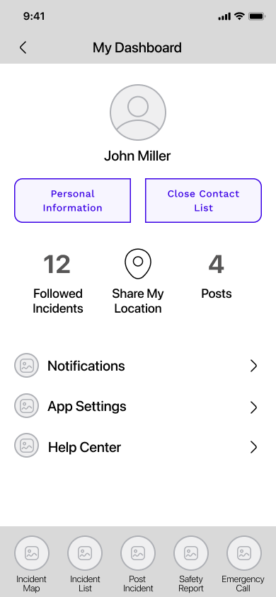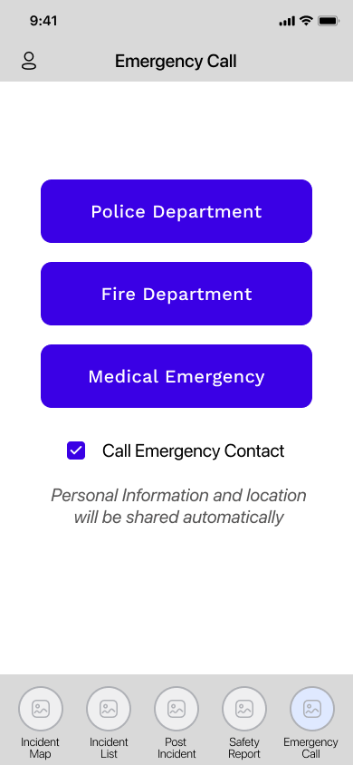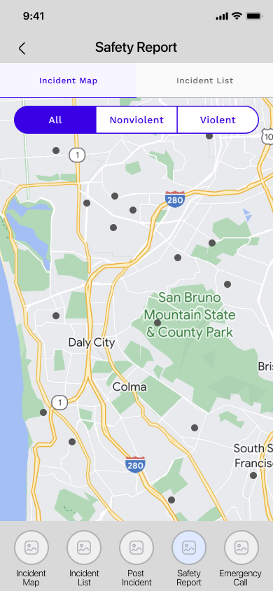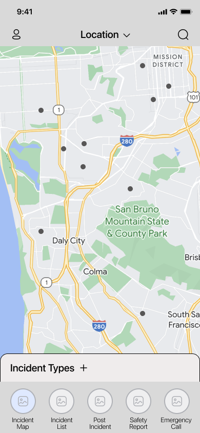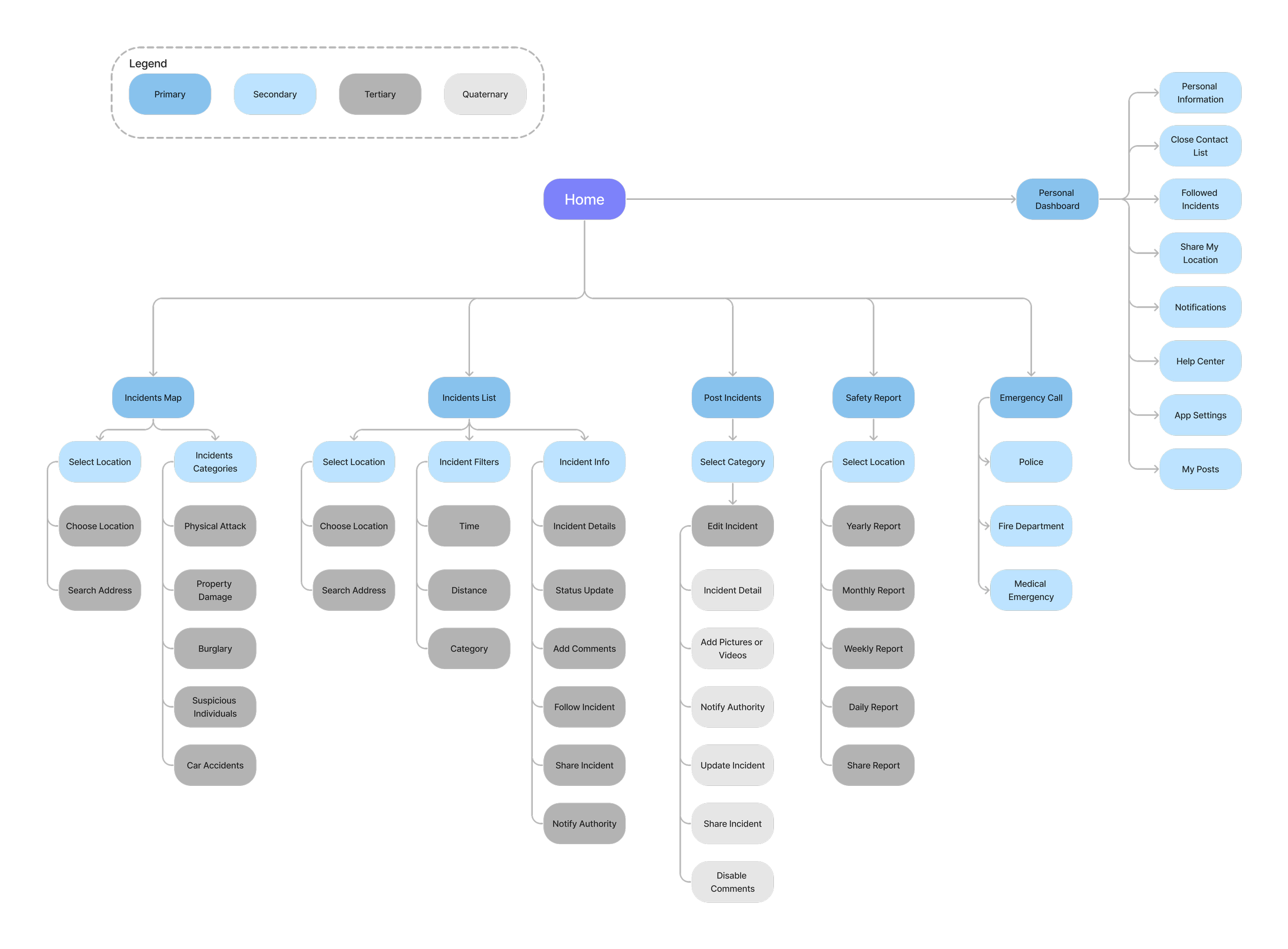 Based on my feature roadmap and the functions I decided to move forward with, I created a sitemap which defined the basic structure for the App. The five main navigations are incident map, incident list, post incident, security report and emergency call.