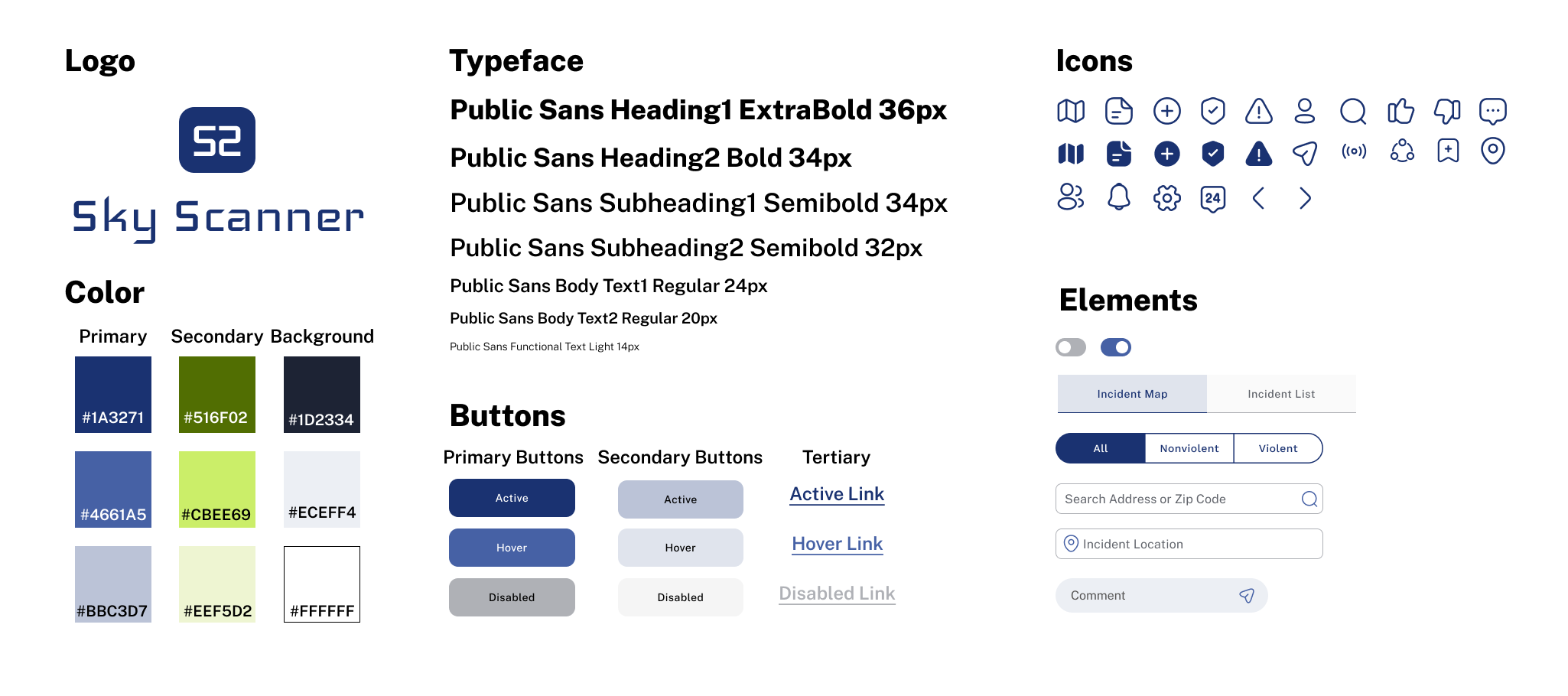 The UI style I was aiming for Sky Scanner emphasizes simplicity, trust, and technology. The typeface I chose for the wordmark features a robotic and technological look, which echoes the core idea of using drone fleets to provide security information. The idea for the logo design comes from the double S from Sky Scanner, which also creates an image of a drone.