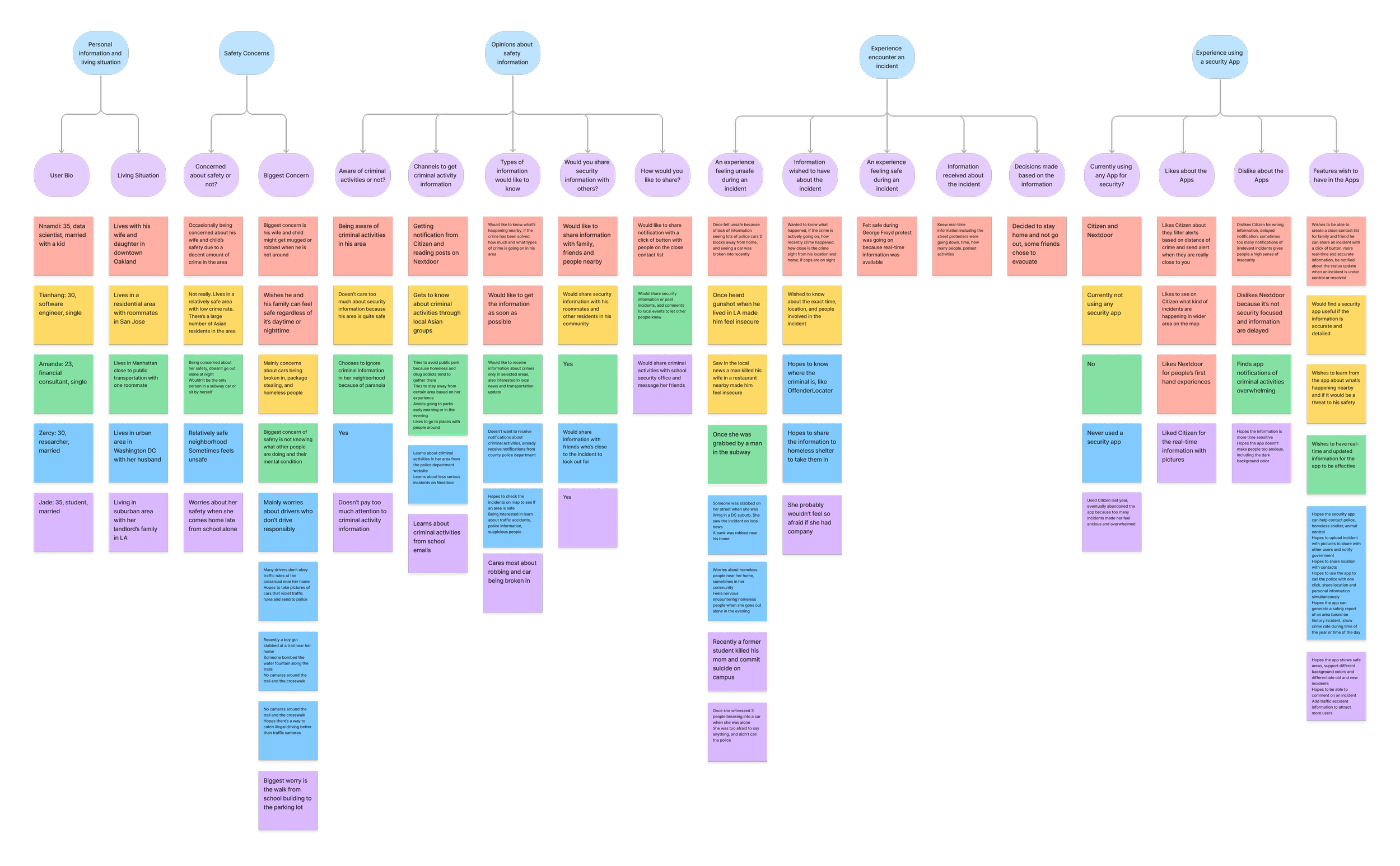 As I analyze my research data, I found out my users generally fall into 2 categories: people who live with their family and would like to look out for the safety of their family, and people who are single and live alone or with roommates, especially young women. These are the 2 user personas emerged from the user research: