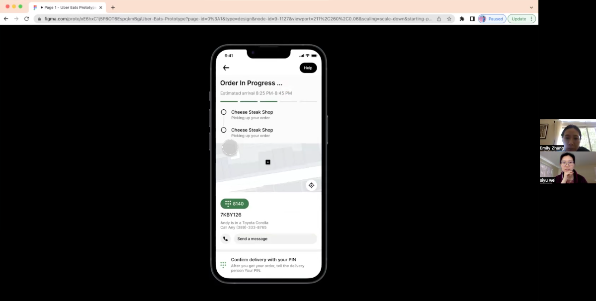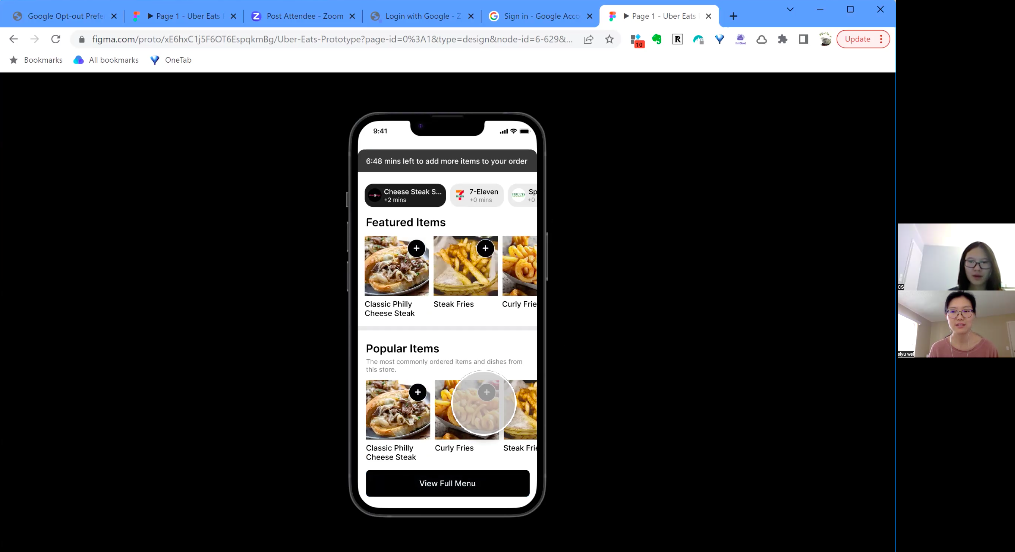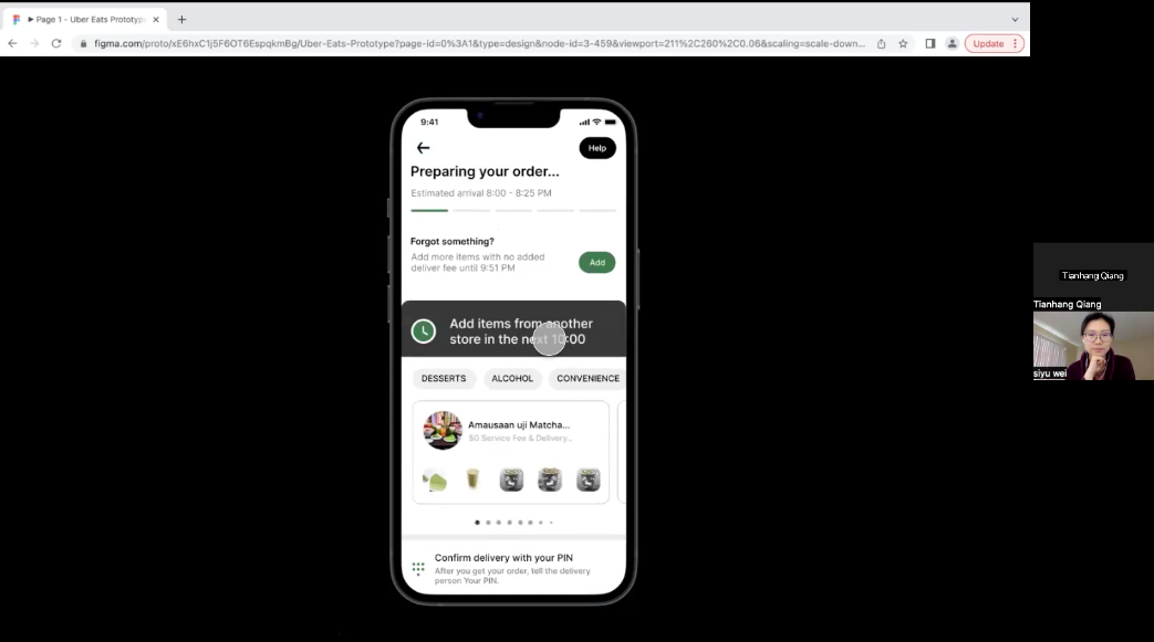 I conducted moderated usability tests on Zoom with 5 participants for this project. All 5 users did the test with their laptop. Users were asked to go through the checkout process and add more items from the same store after placing an order. All 5 participants completed the task successfully.