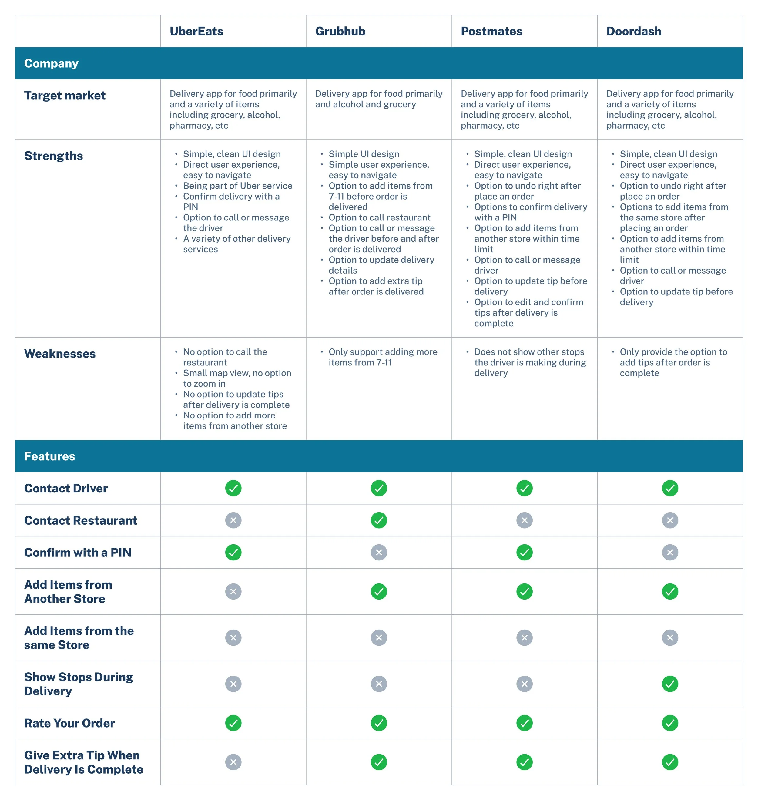 In order to create an intuitive user experience, it is important to learn the competitor App features and the users’ needs. Learning about competitors will help identify the strengths and weaknesses of Uber Eats compared to other food delivery Apps. Understanding the users helps me identify user pain points and how to address them by adding a new feature.