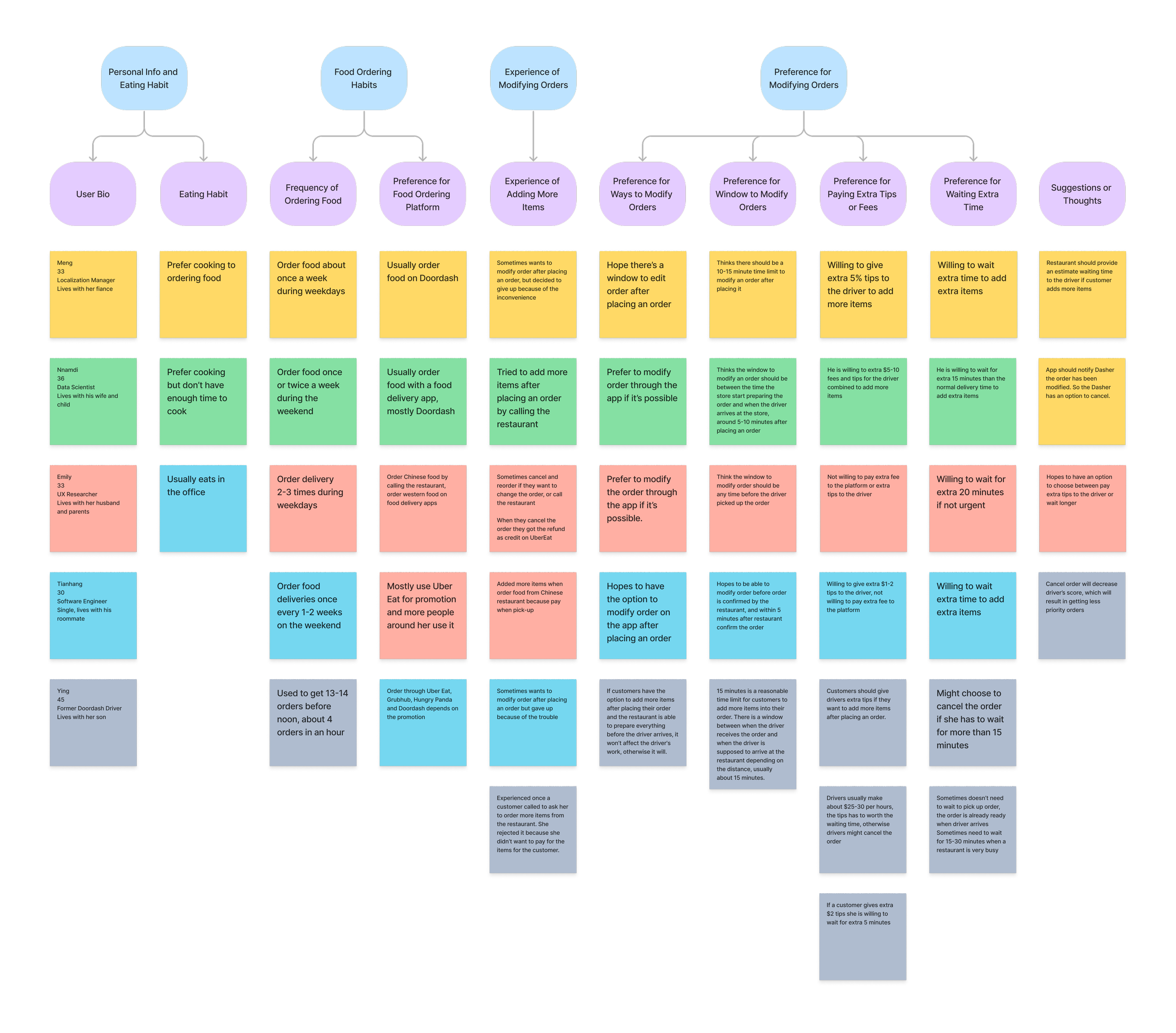 After conducting interviews with users, I took notes from our conversations and created an affinity map to organize their input. I categorized users' opinions into different topics and tried to look for similarities and differences in their ideas. Creating the affinity map helped me identify some interesting trends in users’ needs, which provided me with valuable insight for my design.