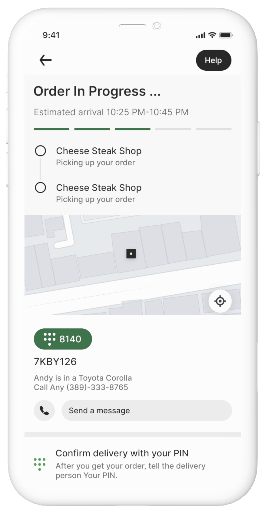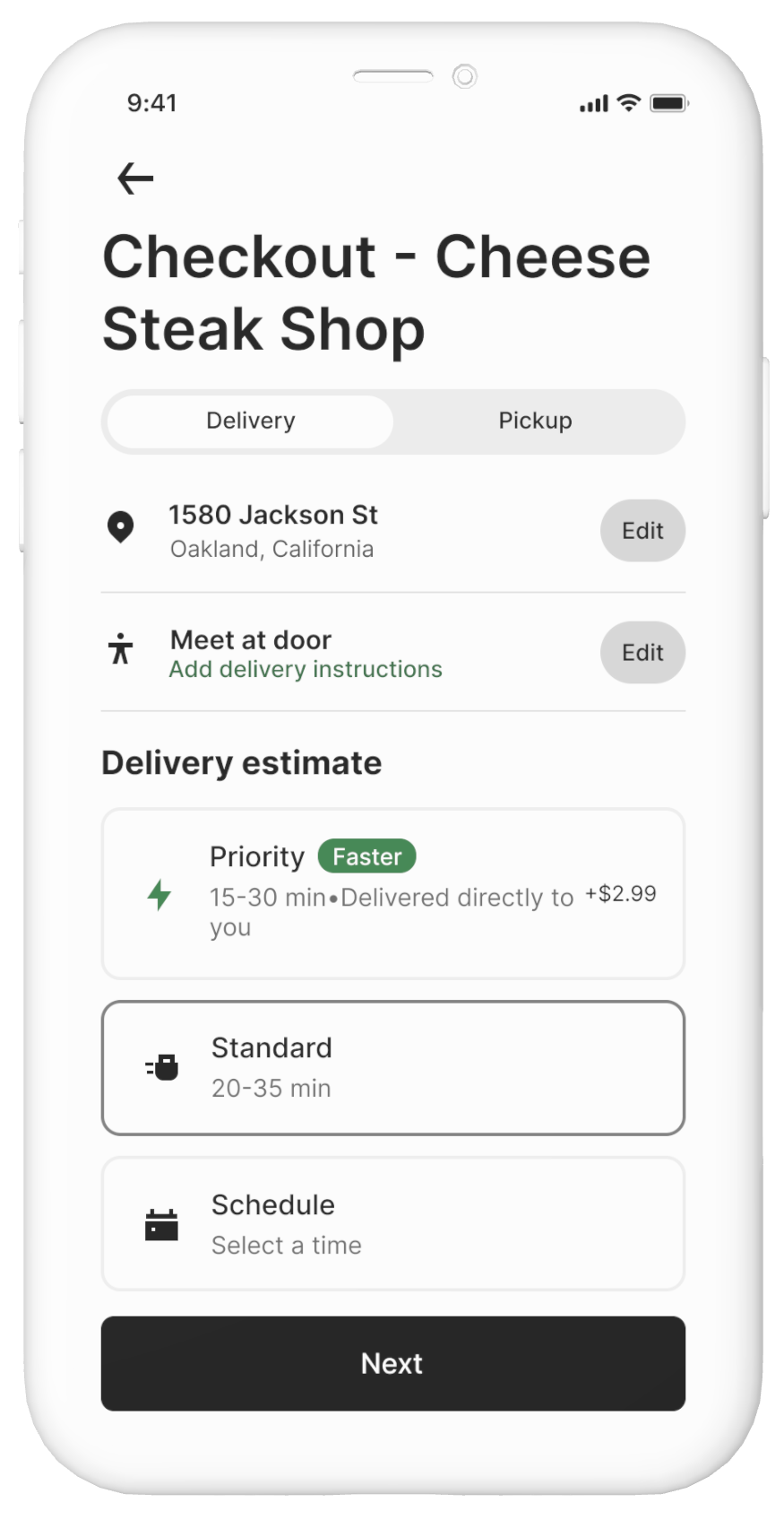 High-fidelity wireframes for the check-out process. The UI style and color palette follows the style guide of Uber Eats to create a consistent visual effect and user experience.