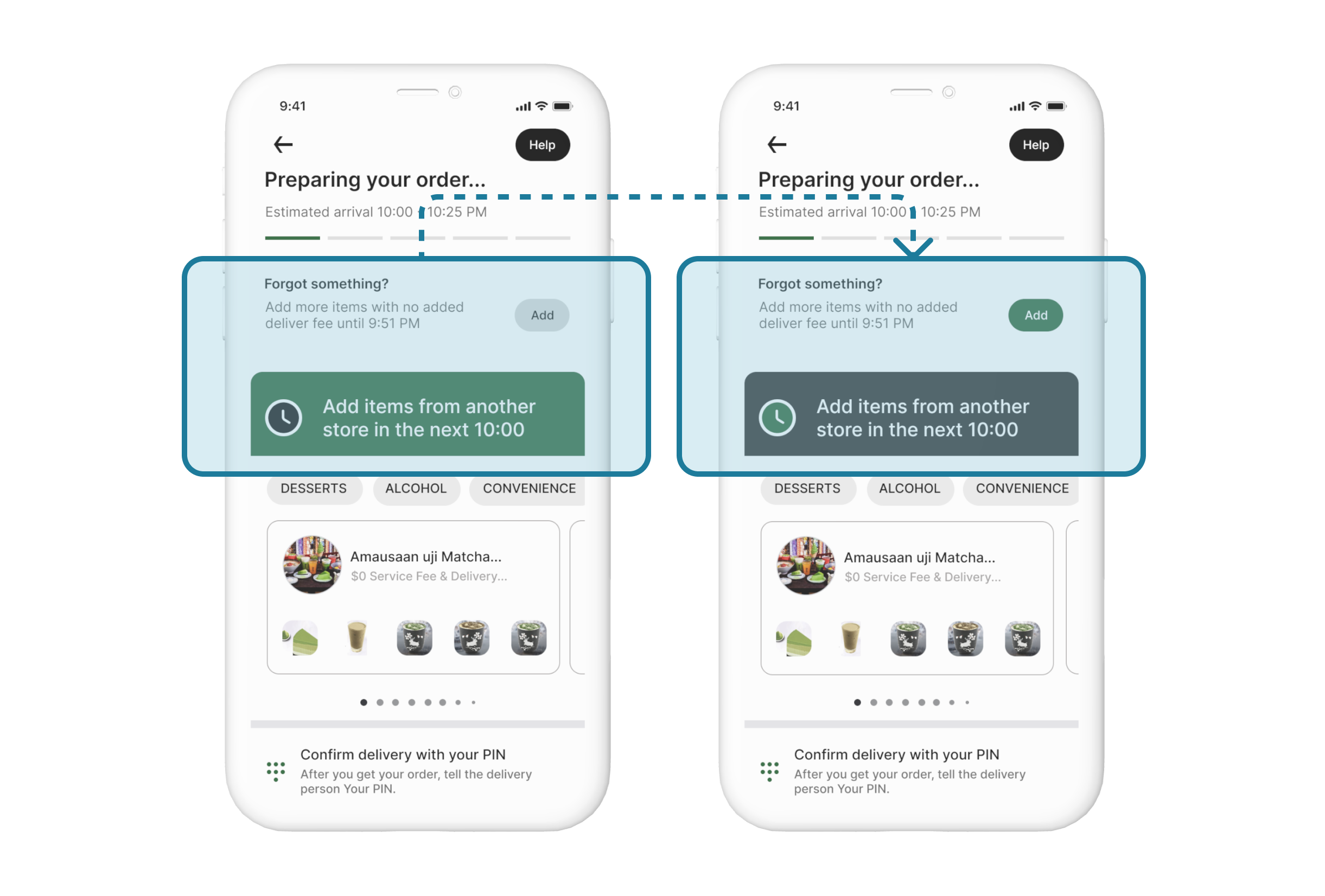 Add a feature to allow users to order additional items with no added delivery fee within 10 minutes.